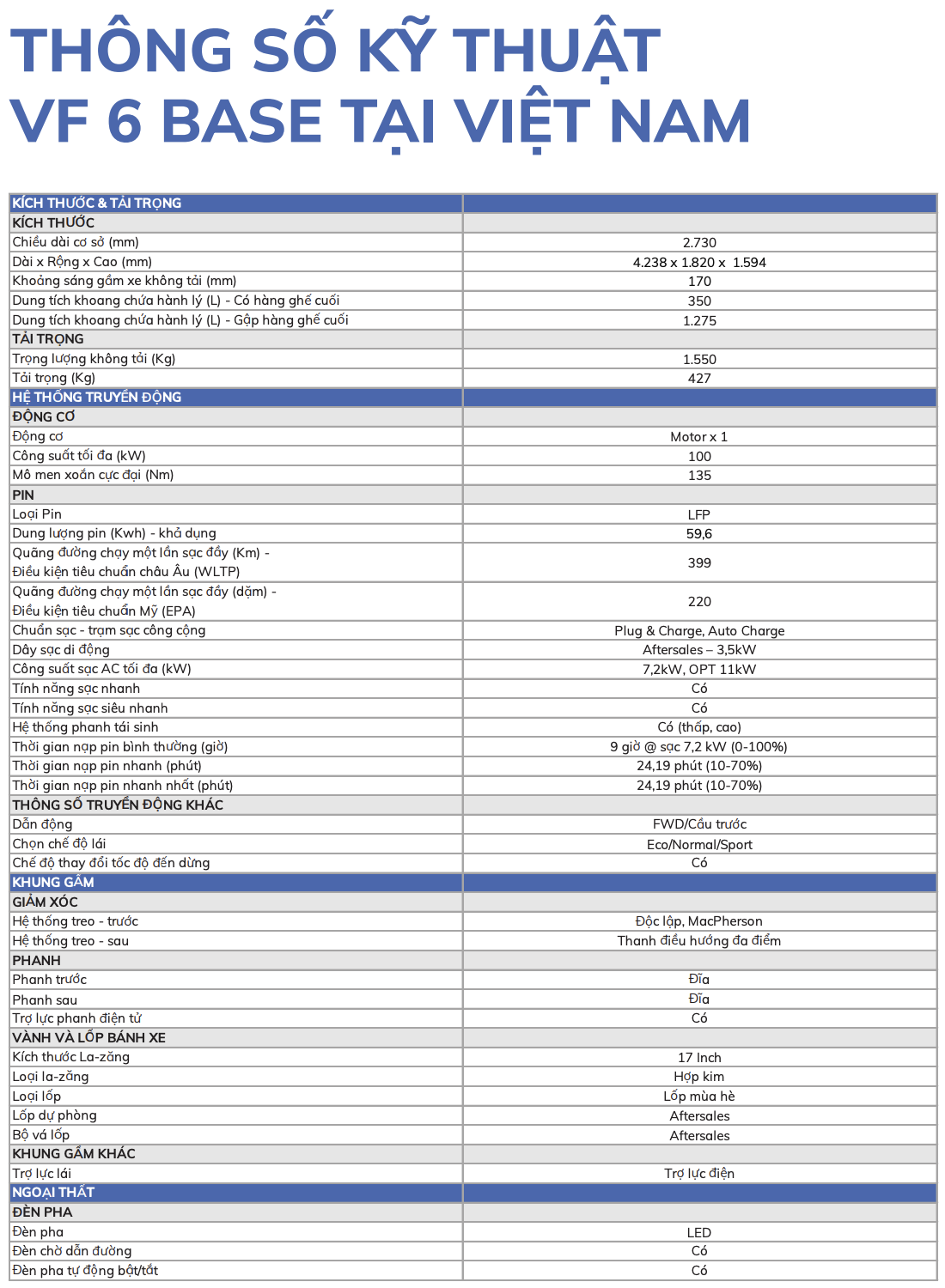 Cả hai phiên bản của VF 6 đều được trang bị pin LFP dung lượng 59,6 kW với phạm vi hoạt động tương ứng là 399 km và 381 km (theo tiêu chuẩn WLTP) cho một lần sạc đầy. Xe sử dụng động cơ điện có công suất tối đa 100 kW và 150 kW, tương ứng với mô-men xoắn cực đại 135 Nm và 310 Nm, cho cảm giác lái hứng khởi và dễ dàng đáp ứng nhu cầu di chuyển của mọi khách hàng.